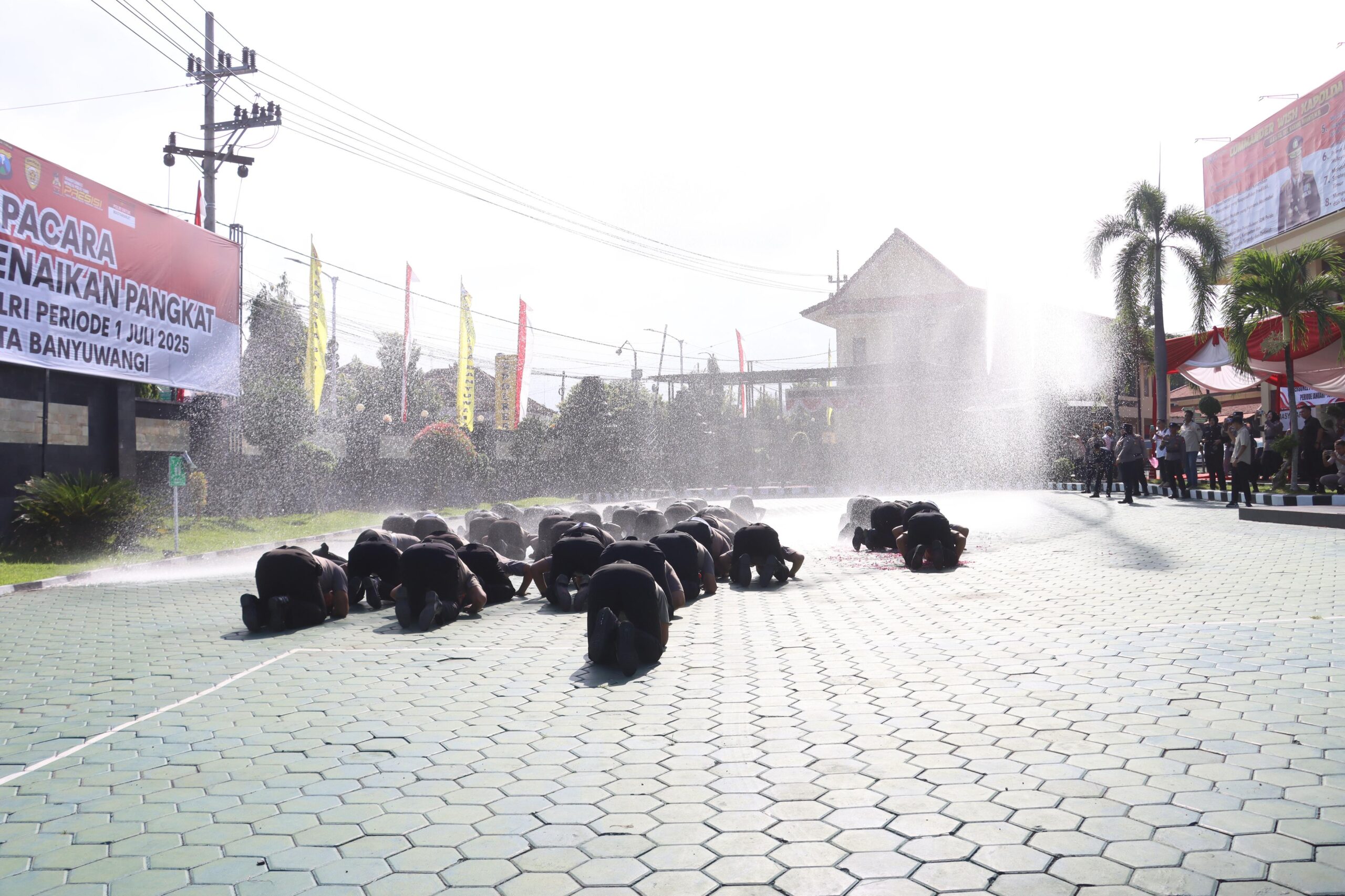 Sebagai ungkapan rasa syukur, dilaksanakan pula penyiraman air menggunakan mobil water cannon, yang menjadi simbol pembersihan diri dan semangat baru dalam mengemban tanggung jawab pangkat yang lebih tinggi.