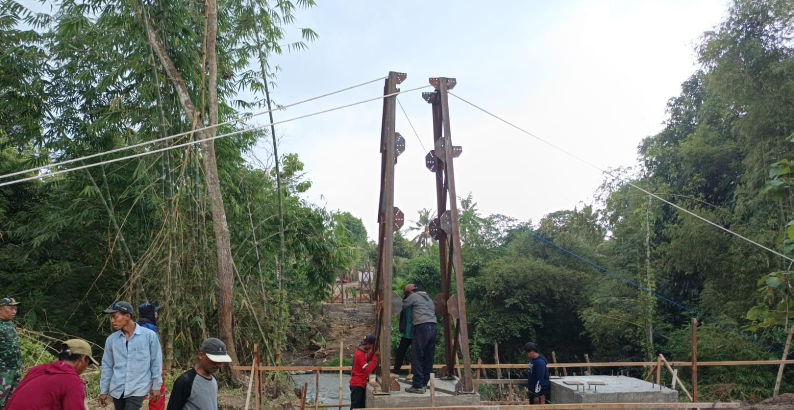 Keterbatasan akses jalan yang tidak memungkinkan masuknya alat berat membuat distribusi material dilakukan secara gotong royong agar setiap komponen jembatan dapat sampai ke titik konstruksi.