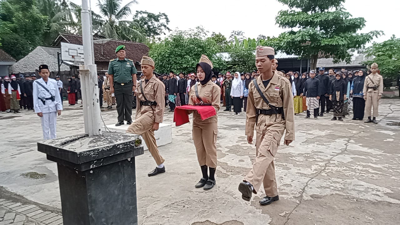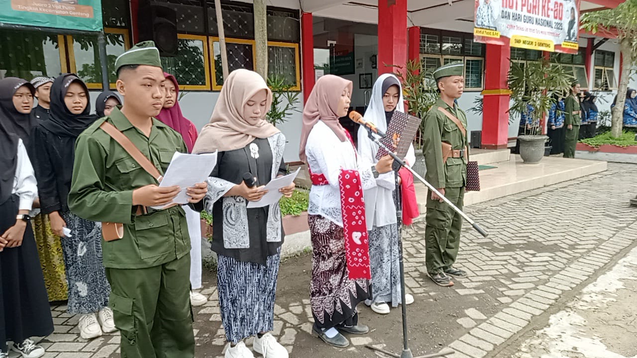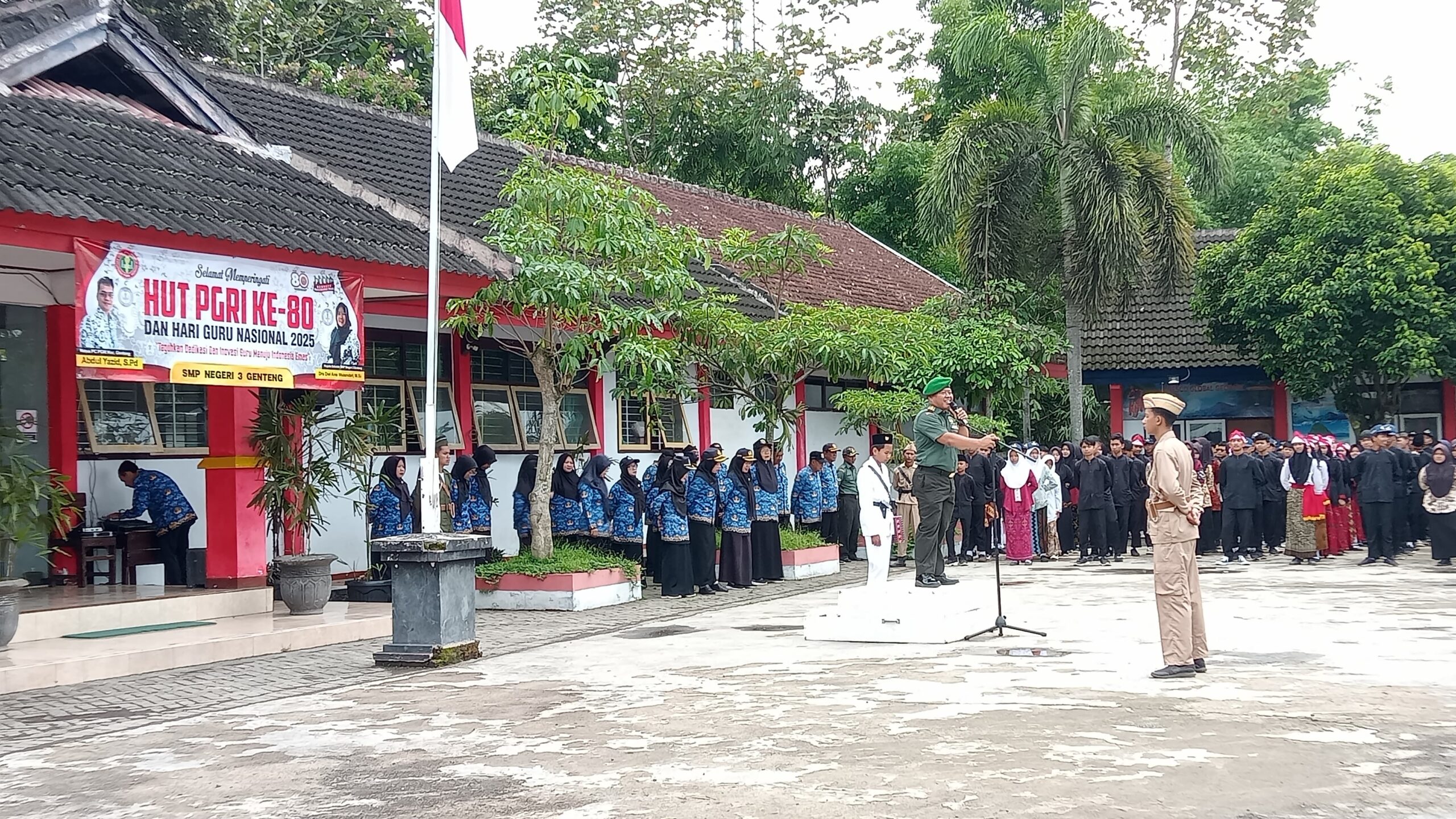 GENTENG – Suasana upacara bendera di SMP Negeri 3 Genteng pada Senin (10/11) pagi terasa berbeda dan penuh semangat patriotisme. Bukan hanya peringatan Hari Pahlawan yang jatuh di tanggal tersebut, tetapi kehadiran sosok anggota TNI dari Koramil 0825-04/Genteng, Pelda Harsono, sebagai pembina upacara utama sukses menyedot perhatian dan membakar semangat ratusan siswa-siswi.