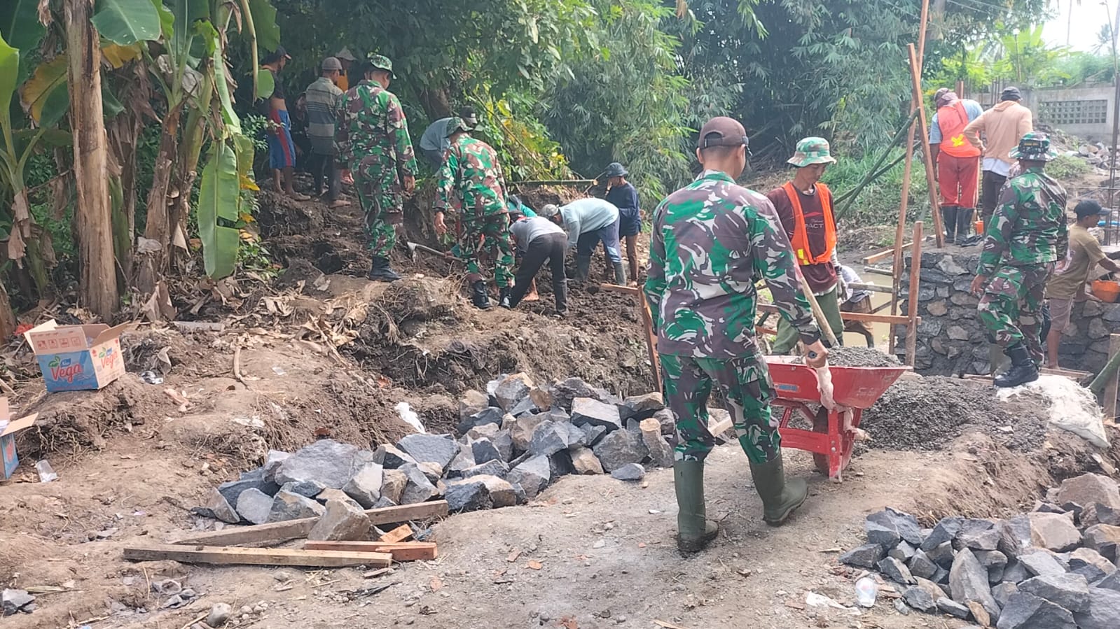 BANYUWANGI, Actanews.id – Kegiatan Pra TMMD ke-125 yang dilaksanakan oleh Kodim 0825/Banyuwangi di Kecamatan Siliragung semakin menunjukkan hasil yang nyata dan PRODUKTIF. Salah satu pemandangan unik sekaligus mengesankan adalah penggunaan angkong (gerobak dorong) yang menjadi alat bantu utama para Babinsa dalam mengangkut material bangunan. (25-06-2025)