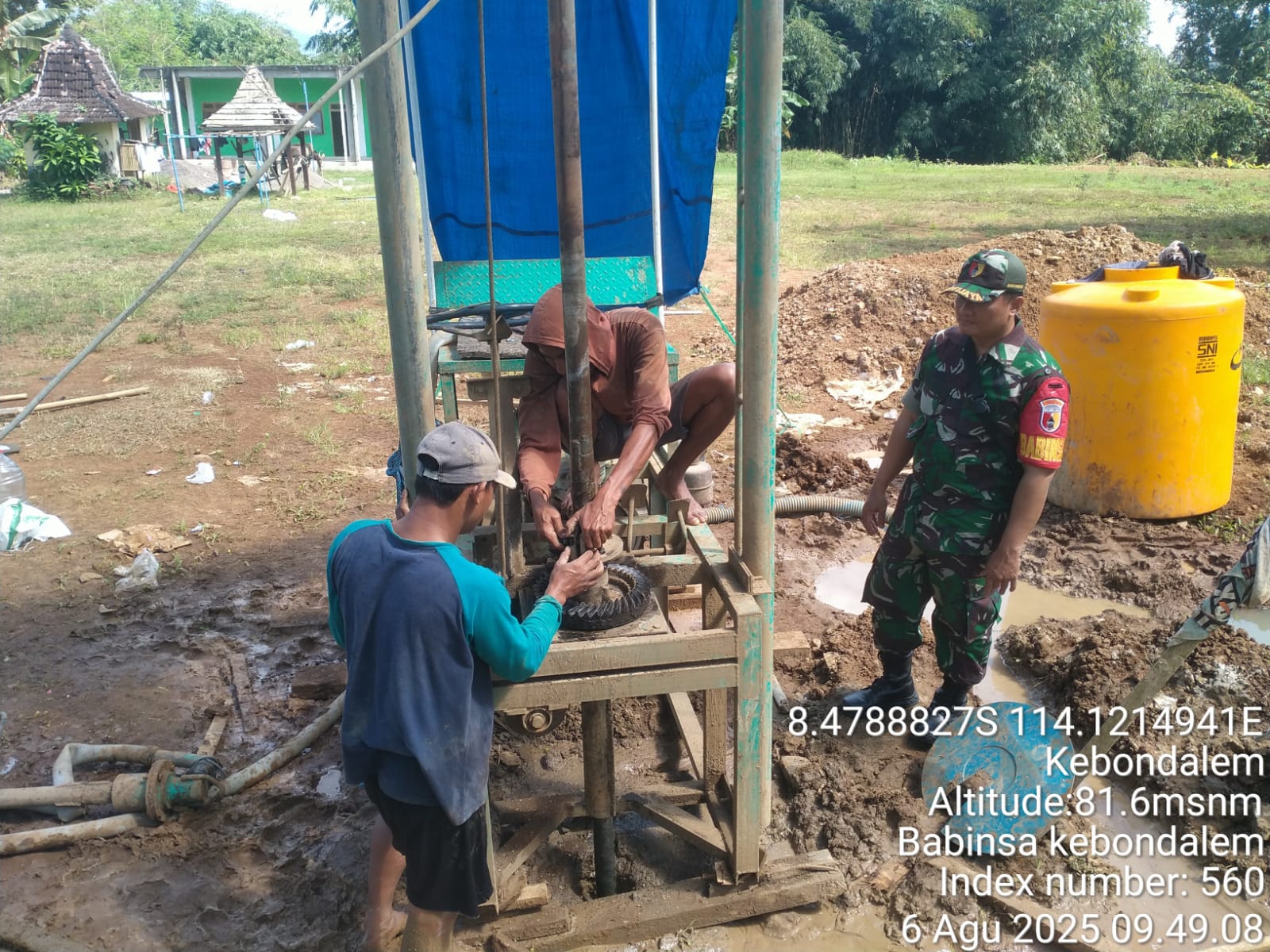BANYUWANGI, Actanews.id – Guna mendukung ketersediaan air bersih bagi warga, Babinsa Desa Kebondalem, Kecamatan Bangorejo, Sertu Eko Widayanto, melakukan monitoring langsung terhadap proses pengeboran sumur di Dusun Kebonrejo pada Rabu (6/8/2025). Kegiatan ini berlangsung sejak pukul 10.00 WIB hingga selesai.