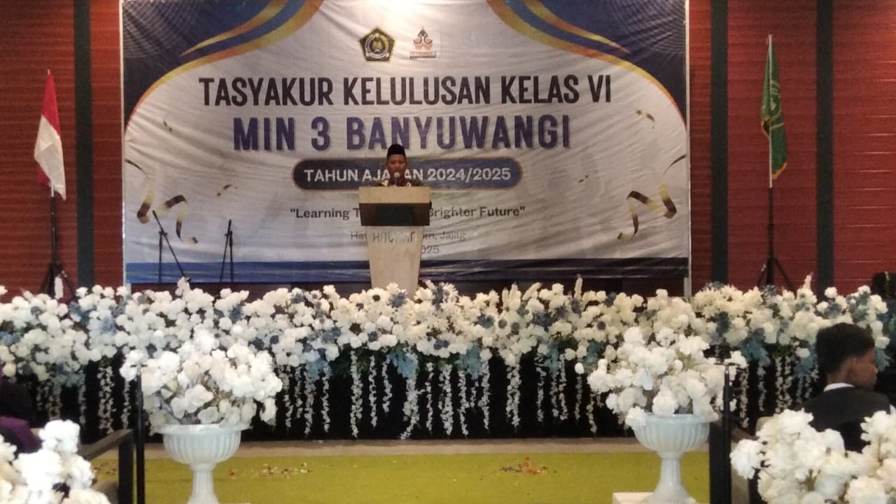 Kepala MIN 3 Banyuwangi, Asro’i, S. Pd.I, , dalam sambutannya mengungkapkan rasa syukur atas kelancaran acara dan prestasi yang telah diraih oleh para siswa. “Kami berharap ilmu yang telah didapatkan di MIN 3 Banyuwangi dapat menjadi bekal berharga bagi anak-anak kami untuk melangkah ke jenjang pendidikan yang lebih tinggi. Jagalah nama baik almamater dan teruslah berprestasi,” pesannya.