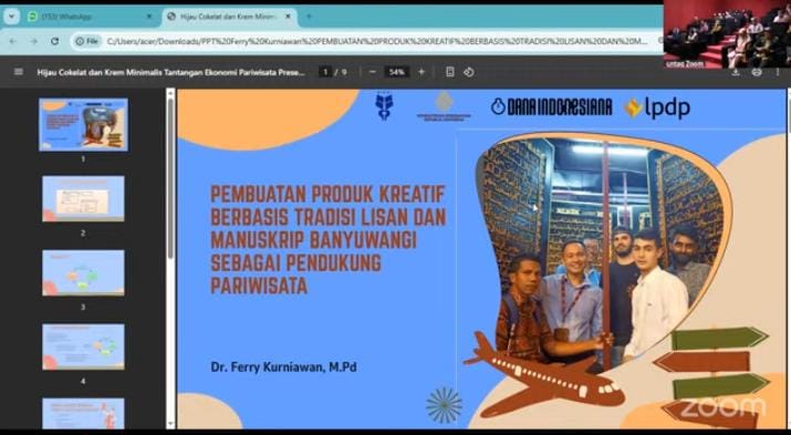 Dalam paparannya, Dr. Ferry menekankan pentingnya memanfaatkan kekayaan tradisi lisan dan manuskrip Banyuwangi sebagai fondasi pengembangan produk ekonomi kreatif yang relevan dengan perkembangan industri pariwisata. Ia menyebut bahwa pendekatan budaya lokal dapat menjadi nilai unggul sekaligus pembeda dalam ekosistem wisata berkelanjutan.