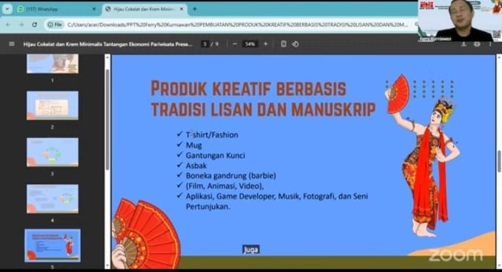 Kegiatan yang berlangsung Kamis (29/5/2025) sejak pukul 08.30 hingga 12.00 WIB ini menghadirkan Dr. Ferry Kurniawan, M.Pd., Wakil Sekjen HISKI sekaligus akademisi yang dikenal aktif dalam riset dan pengembangan industri kreatif berbasis budaya. Bertempat secara virtual melalui Zoom Meeting, sesi ini dimoderatori oleh Sudartomo Macaryus, M.Hum., Ketua HISKI UST-UTY, dan diikuti secara antusias oleh peserta dari berbagai kalangan, mulai dari guru, dosen, mahasiswa, seniman, hingga pelajar.