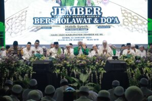 “Jember merupakan salah satu pusat ilmu keagamaan, dan saya diminta oleh Bupati Jember untuk membumikan sholawat di Kabupaten Jember agar seluruh masyarakat Jember dan dunia bisa selamat di dunia dan akhirat,” ujar Habib Syech.