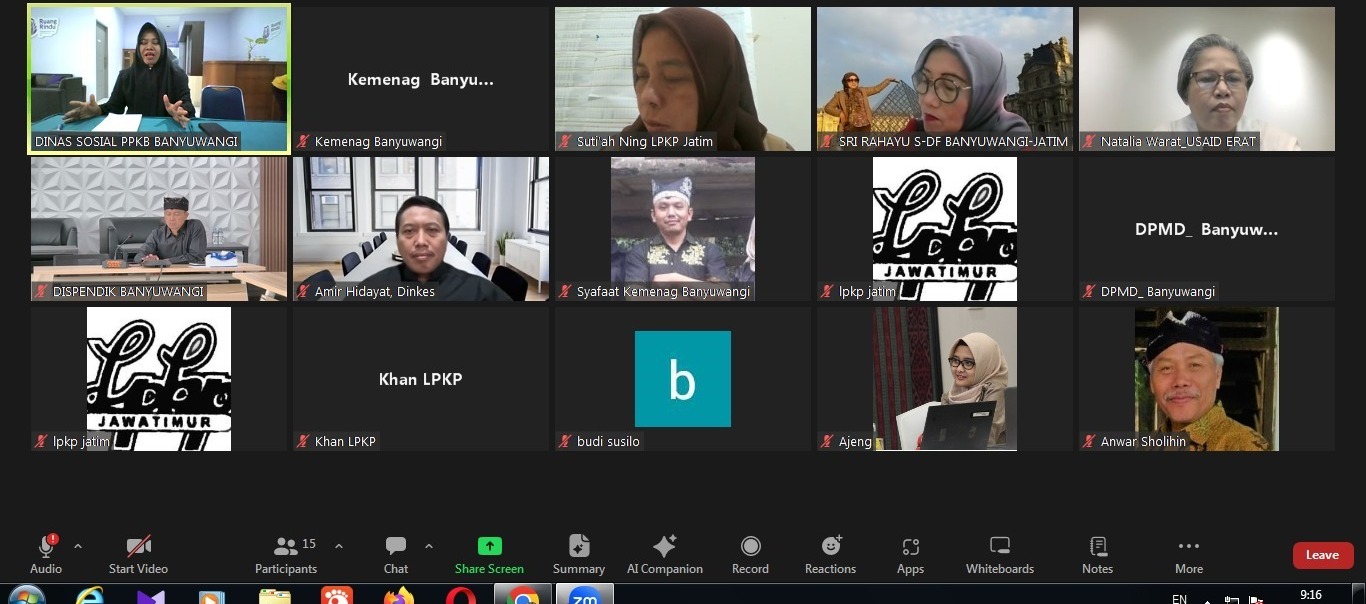 Banyuwangi, Actanews.id- Pencegahan perkawinan anak menjadi sorotan utama dalam rapat koordinasi yang diadakan oleh United States Agency for International Development (USAID ERAT) melalui zoometing di Kabupaten Banyuwangi pada Kamis (15/02/2024). Rapat ini dihadiri oleh berbagai pihak, seperti Kepala Kantor Kementerian Agama, Kepala Dinas Sosial Pemberdayaan Perempuan, Perlindungan Anak dan Keluarga Berencana, Kepala Dinas Pendidikan, Kepala Dinas Kesehatan, dan beberapa pihak lainnya.