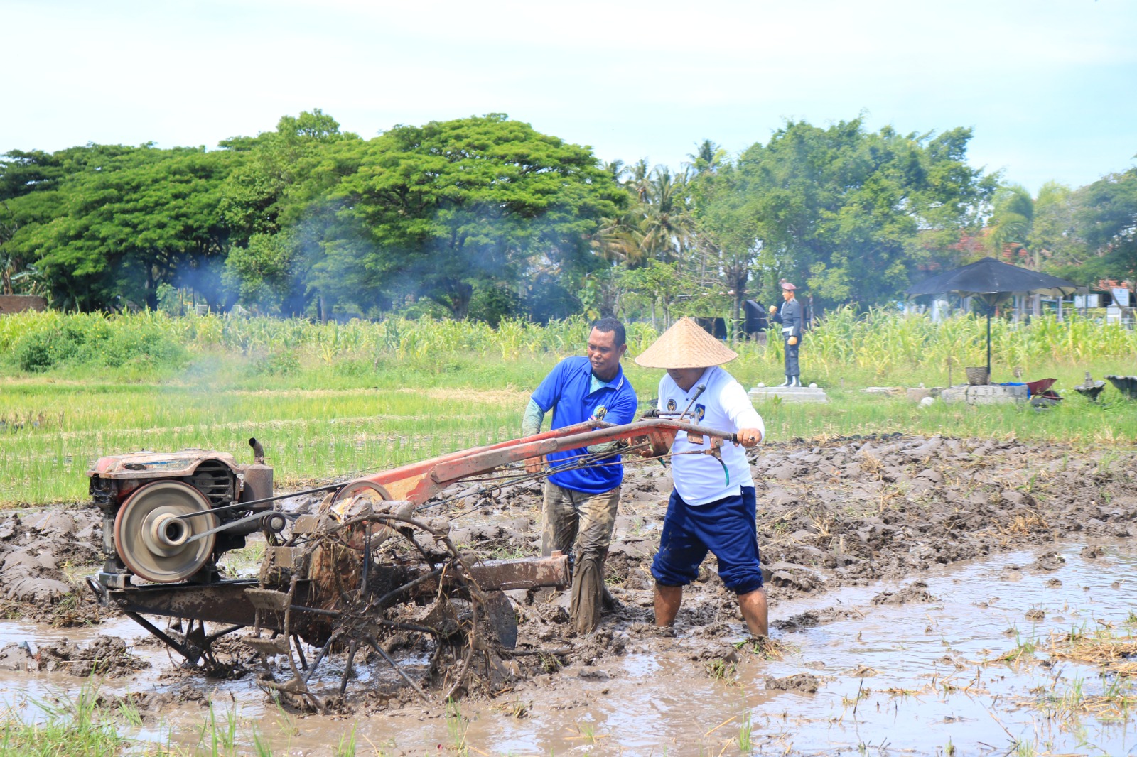Dengan mengenakan pakaian lapangan, Kalapas Wayan tampak menyingsingkan lengan bajunya dan mengoperasikan traktor tangan di tengah lumpur. Ia memimpin langsung kegiatan pembajakan lahan yang akan ditanami berbagai komoditas pertanian unggulan.
