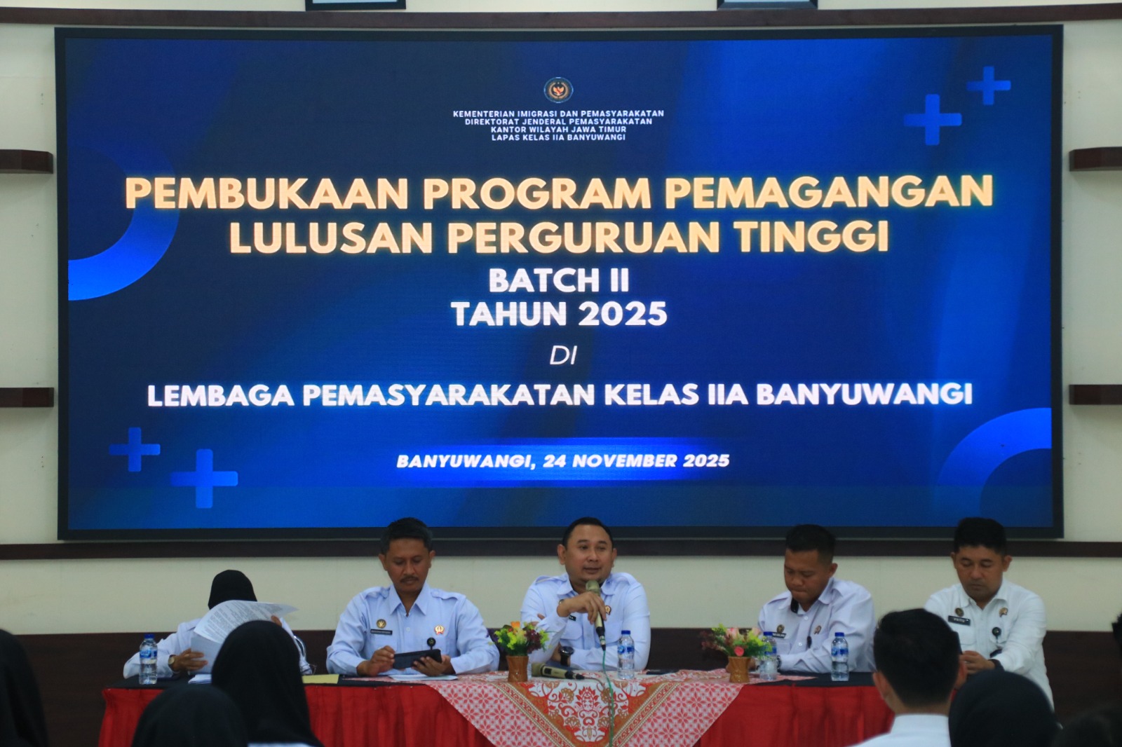 BANYUWANGI – Lembaga Pemasyarakatan (Lapas) Kelas IIA Banyuwangi resmi memulai program pemagangan bagi 36 peserta yang lolos seleksi Program Pemagangan Nasional Batch 2 Kementerian Ketenagakerjaan (Kemnaker). Para peserta mengikuti sesi orientasi perdana pada Senin (24/11), yang menandai dimulainya rangkaian kegiatan magang di lingkungan Lapas.