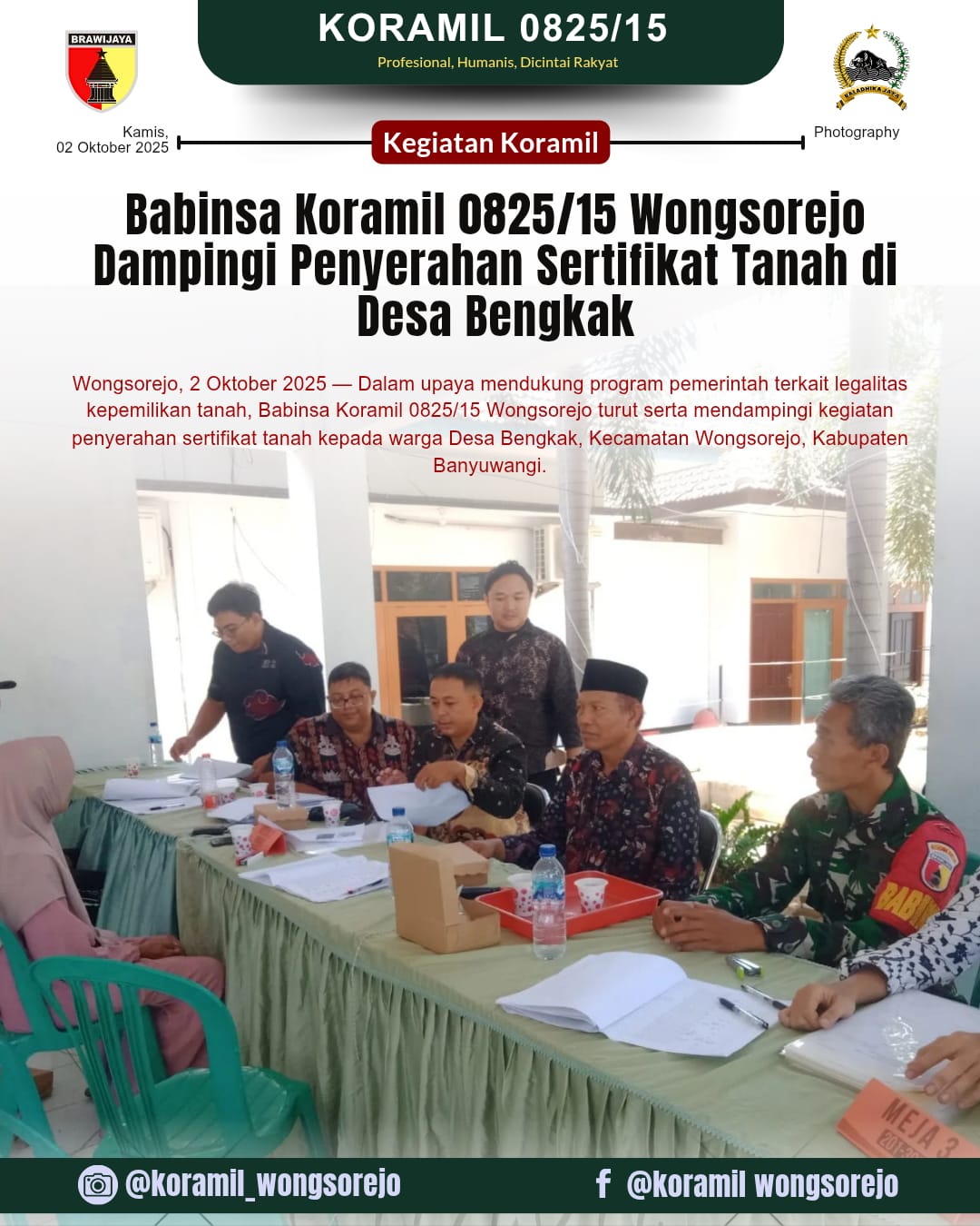 Wongsorejo, 2 Oktober 2025 — Dalam upaya mendukung program pemerintah terkait legalitas kepemilikan tanah, Babinsa Koramil 0825/15 Wongsorejo turut serta mendampingi kegiatan penyerahan sertifikat tanah kepada warga Desa Bengkak, Kecamatan Wongsorejo, Kabupaten Banyuwangi.