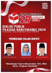 Dialog publik ini digelar di Ballroom Ijen Hotel Santika, Kecamatan Banyuwangi, dan dihadiri oleh para pembicara bakal calon kandidat Pilkada, yakni KH Ahmad Munif Syafaat, Drs.Ratna Ani Restari, dan Michael Edy Hariyanto, M.H. Para panelis yang turut hadir antara lain KH.Ahmad Wahyudi dan Dr.Emi Hidayati, dan Karyono sebagai pembawa acara.