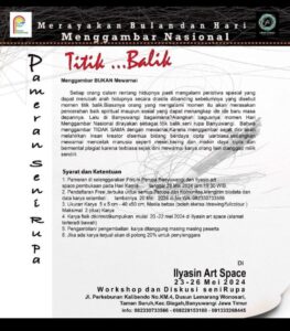 Actanews.id – Dalam rangka memperingati Bulan Menggambar Nasional 2024, Forum Perupa Banyuwangi (FPB) berkolaborasi dengan Komunitas Lentera Sastra menggelar Pameran Seni Rupa bertajuk “Titik Balik”. Bertempat di Ilyasin Art Space, Dusun Pelantaran, Desa Taman Suruh, Kecamatan Glagah, acara ini digelar selama 4 hari, mulai 23 hingga 26 Mei 2024.