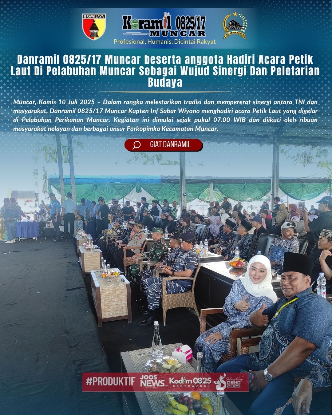 “Tradisi Petik Laut ini bukan sekadar ritual adat, tetapi juga momentum untuk mempererat persatuan, memupuk nilai-nilai kearifan lokal, serta memperkuat sinergi antara TNI dan masyarakat. Kami dari Koramil 0825/17 Muncar senantiasa mendukung kegiatan budaya yang positif seperti ini,” ujarnya.
