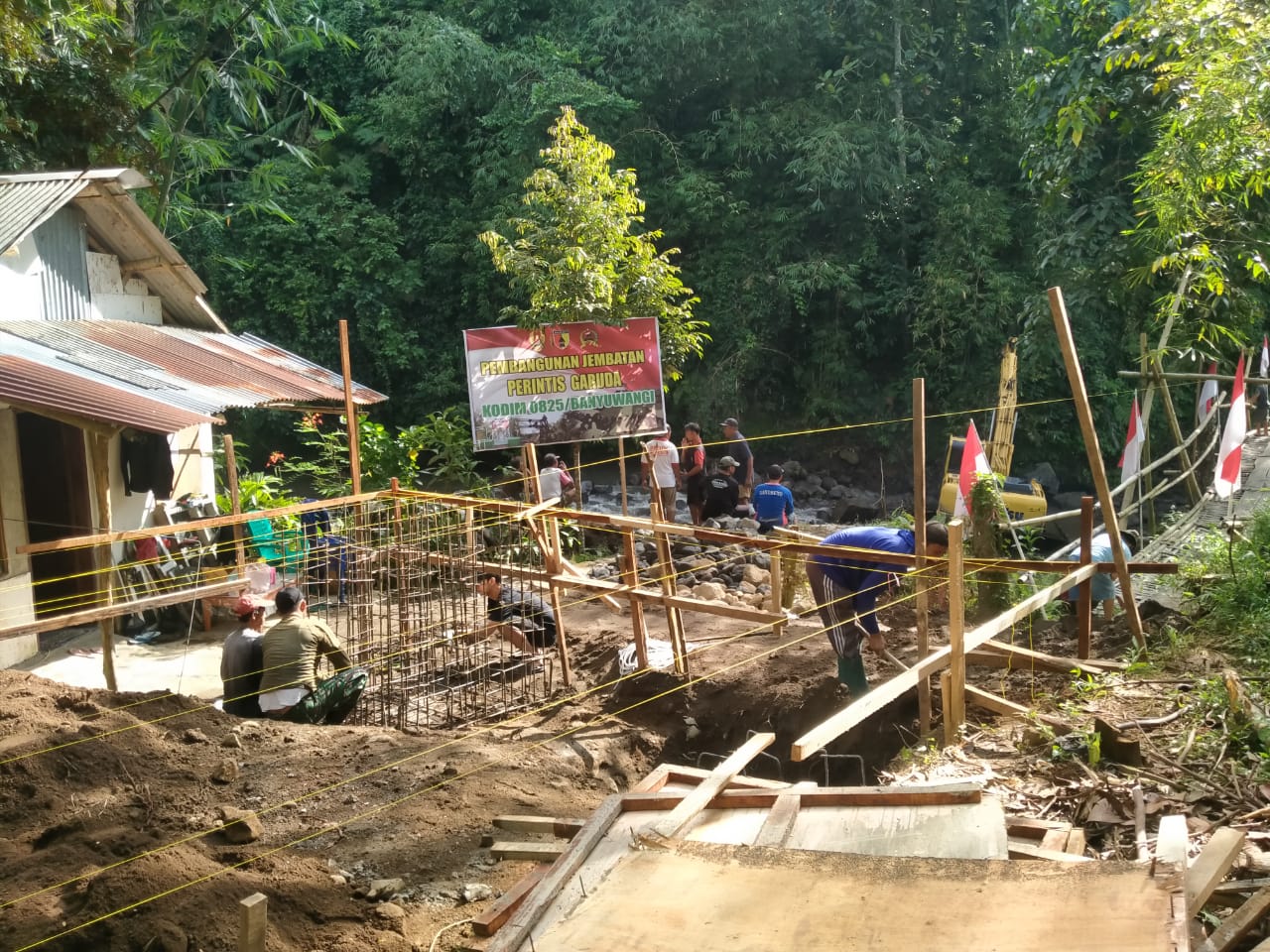 Mobilisasi yang hadir di lokasi bukanlah kaleng-kaleng. Bati Bhakti TNI Kodim 0825, Anggota Zibang, jajaran Koramil lintas wilayah, mulai dari 0825/08 Srono, 12 Rogojampi, 13 Singojuruh, 14 Kabat, hingga 0825/19 Sempu, semuanya bahu-membahu tanpa sekat kepangkatan. Kepala Desa Songgon M. Qoderi, Kepala Dusun Krajan Bp. Nanang, serta Kepala Dusun Gumukcandi Bp. Muhklis turut serta mendampingi, bersama warga kedua dusun yang tak mau ketinggalan menjadi bagian dari sejarah kecil yang tengah mereka tulis bersama.