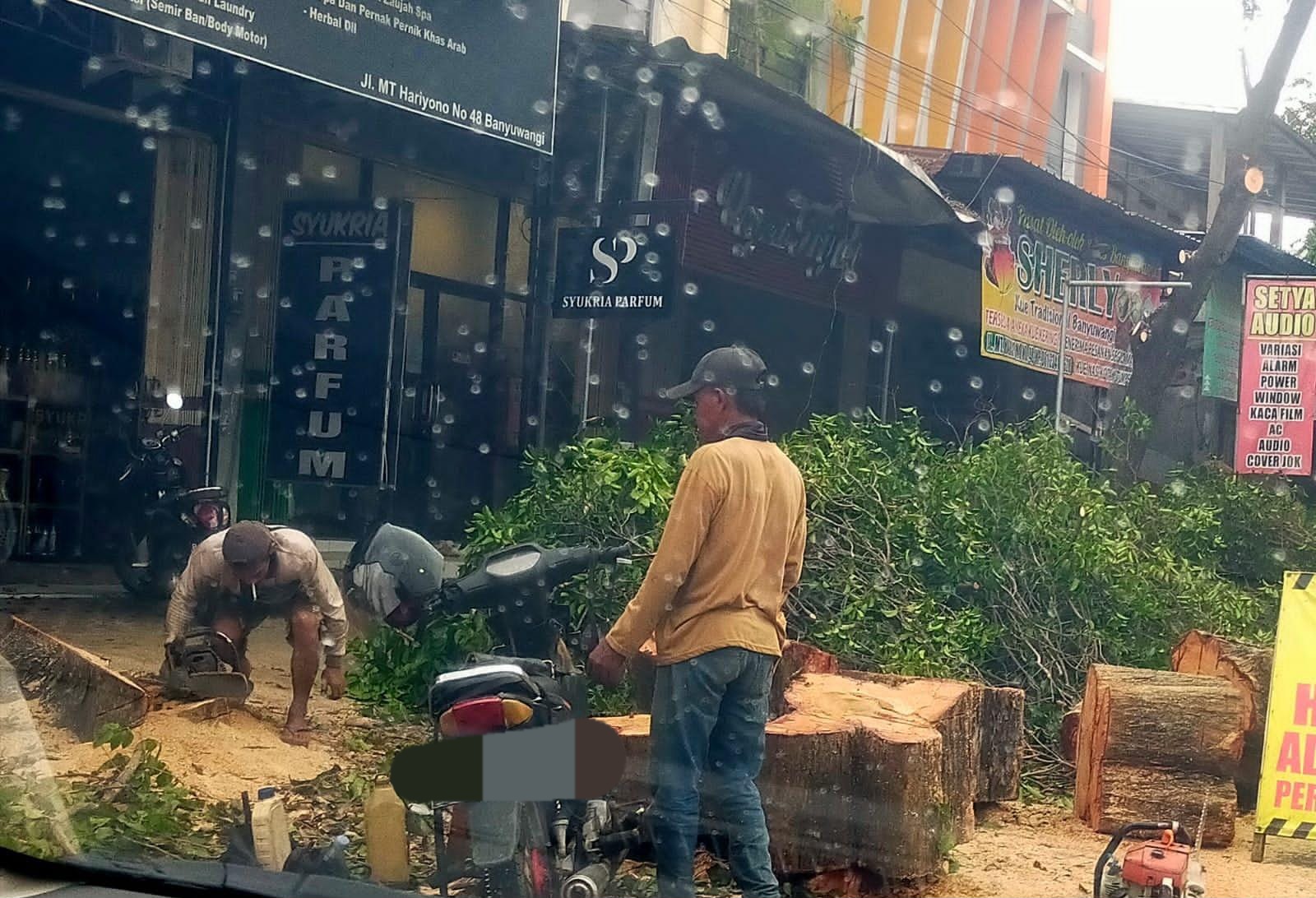 Jasil pantauan di lokasi pada Selasa (27/1/2026) siang, sejumlah pekerja terlihat menebang pohon di depan Toko Aneka Warna Perkasa dan Syukria Parfume menggunakan gergaji mesin dan peralatan lainnya. Pohon-pohon yang ditebang diketahui merupakan pohon perindang yang ditanam Pemerintah Kabupaten Banyuwangi sebagai bagian dari program penghijauan kota.