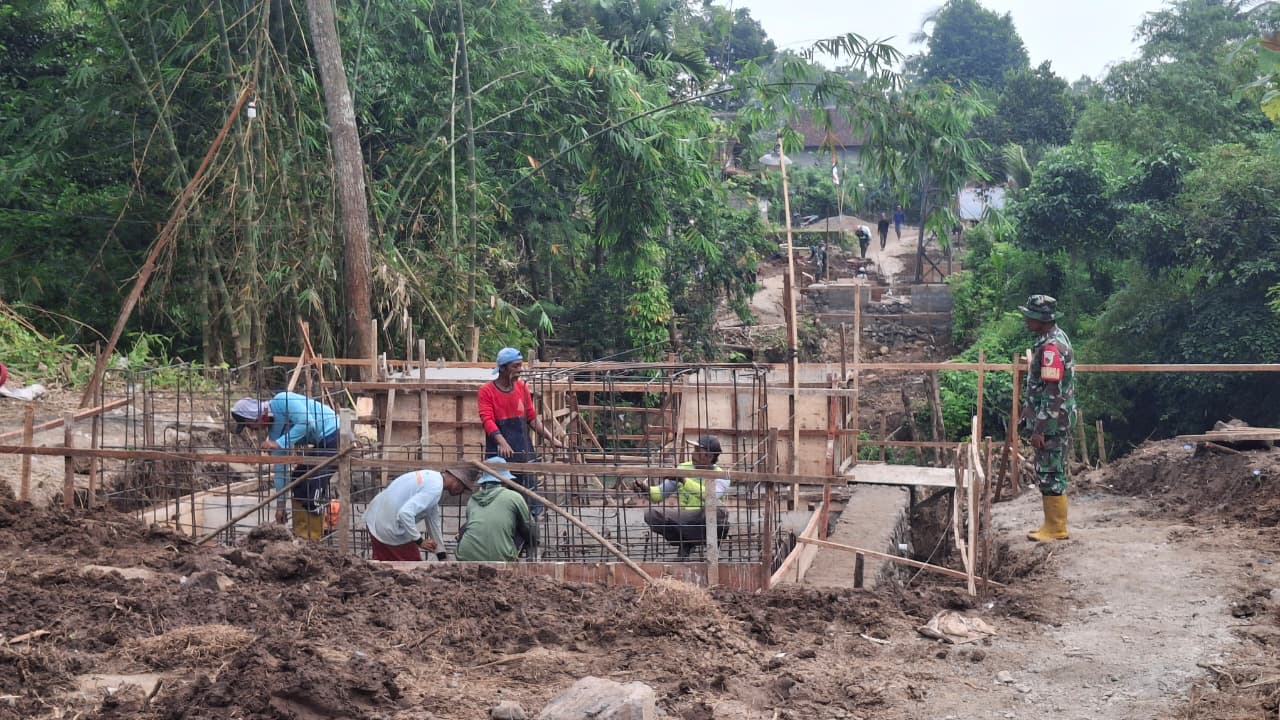 Sejak pagi hari, personel TNI bersama warga setempat tampak bahu-membahu mengerjakan sejumlah tahapan konstruksi, mulai dari penataan badan jembatan, perakitan besi tulangan, hingga perataan material dasar. Semangat gotong royong menjadi kunci utama dalam pelaksanaan karya bakti tersebut.