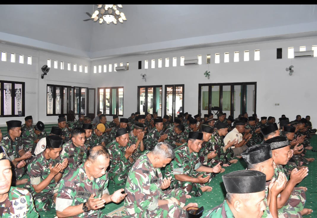 Doa bersama tersebut turut dihadiri oleh Dandim 0825/Banyuwangi Letkol Arm Triyadi Indrawijaya, S.H., M.I.P., Kasdim 0825 Mayor Kav Suprapto, para perwira staf, jajaran Danramil, anggota Kodim, serta para PNS Kodim 0825 Banyuwangi. Rangkaian kegiatan diawali dengan pelaksanaan salat Jumat oleh seluruh personel, yang kemudian dilanjutkan dengan doa bersama dipimpin Serda El Hakim Kurniawan. Momentum ini menjadi wadah refleksi dan penguatan moral bagi para prajurit dalam menjalankan tugas pengabdian.