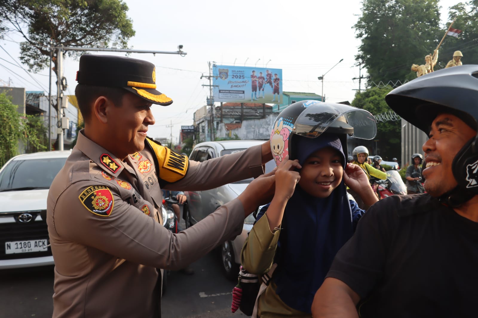 “Sebagai wujud kepedulian dan kasih sayang Polri kepada masyarakat, kami membagikan helm, cokelat, dan meminta pengendara selalu tertib berlalu lintas,” bebernya