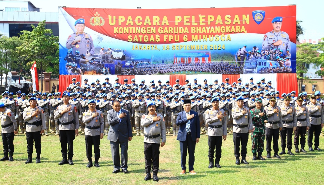Jakarta, Actanews.id – Wakapolri Komjen Pol Agus Andrianto memimpin upacara pelepasan kontingen Garuda Bhayangkara Satuan Tugas Formed Police Unit (FPU) 6 MINUSCA dalam penugasan misi pemeliharaan perdamaian PBB ke negara Afrika Tengah. Upacara dilaksanakan di lapangan Bhayangkara Mabes Polri, Jakarta, Rabu (18/9/2024).