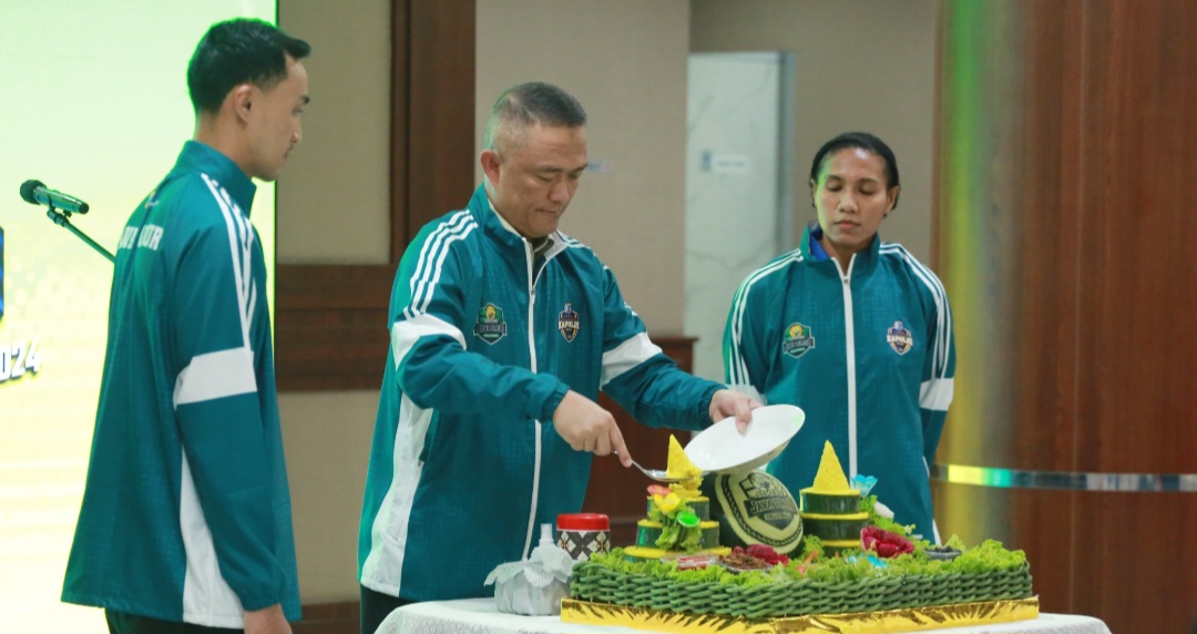 Sebelum memberangkatkan tim bola voli Polda Jatim, Kapolda Jatim memberikan jaket kepada masing masing kapten tim bola voli putra dan putri dilanjutkan pemotongan tumpeng.