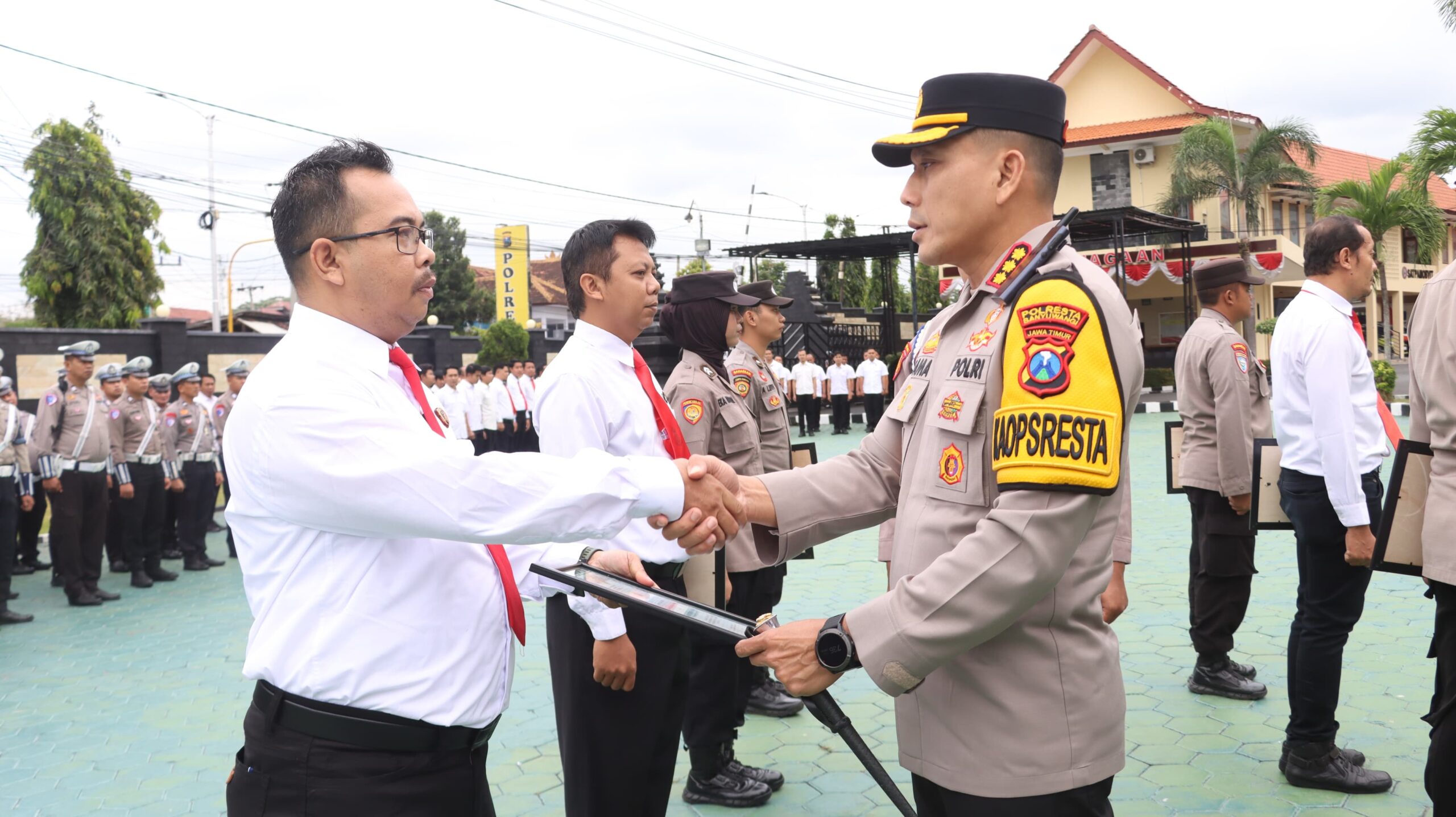 Banyuwangi, Actanews.id – Kepala Kepolisian Resor Kota (Kapolresta) Banyuwangi Kombes Pol Rama Samtama Putra, S.I.K., M.Si., M.H., memberikan penghargaan kepada 43 personel Polresta Banyuwangi dan Polsek jajaran yang berprestasi di berbagai bidang. Pemberian penghargaan berlangsung pada apel di Lapangan Apel Polresta Banyuwangi, Senin (8/9/2025).