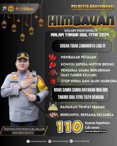 Dengan imbauan ini, diharapkan Malam Takbir dan perayaan Idul Fitri dapat berjalan dengan aman, tenteram, dan penuh keberkahan bagi seluruh masyarakat Kabupaten Banyuwangi.
