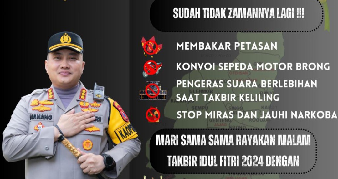 Actanews.id- Dalam menyambut Malam Takbir Hari Raya Idul Fitri 1445 H, Kombes Pol Nanang Haryono, Kapolresta Banyuwangi, mengeluarkan imbauan penting kepada masyarakat untuk menjaga kondusivitas acara tersebut.
