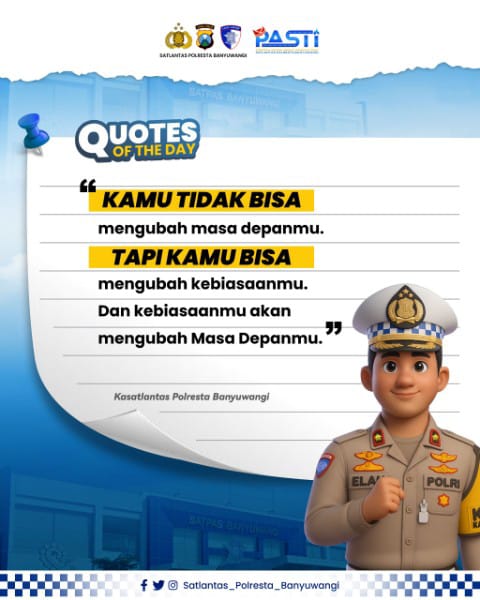 BANYUWANGI, Actanews.id – (5/01/2026) Satuan Lalu Lintas (Satlantas) Polresta Banyuwangi terus mengajak masyarakat untuk menumbuhkan kesadaran dan kedisiplinan berlalu lintas sebagai bagian dari budaya sehari-hari. Pesan tersebut disampaikan melalui Quotes of the Day oleh Kasat Lantas Polresta Banyuwangi, Kompol Elang Prasetyo.