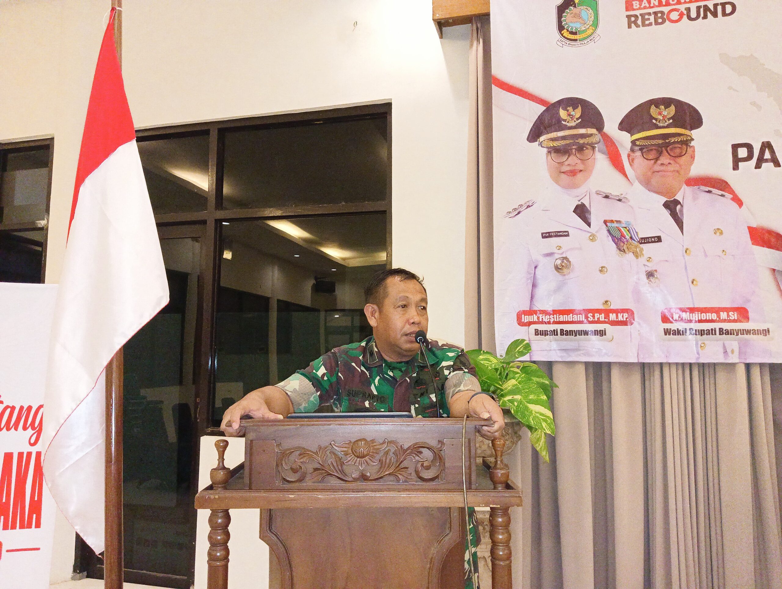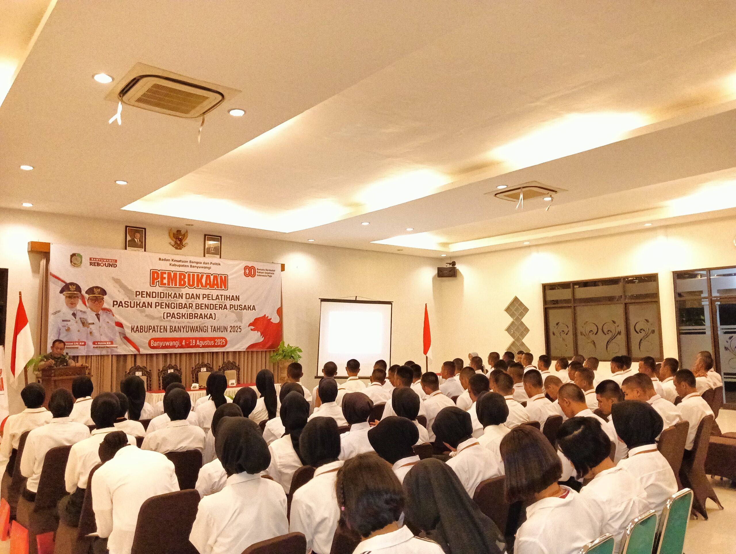 Banyuwangi, Actanews.id  – Kepala Staf Kodim (Kasdim) 0825/Banyuwangi, Mayor Kav Suprapto, memberikan pembekalan materi Wawasan Kebangsaan (Wasbang) dan Bela Negara kepada peserta didik Paskibraka Kabupaten Banyuwangi Tahun 2025. Kegiatan ini digelar di Aula Hotel Tanjung Asri, Kelurahan Penataban, Kecamatan Giri, Rabu (13/8/2025) malam, mengusung tema “Tonggak Sejarah Bangsa”.