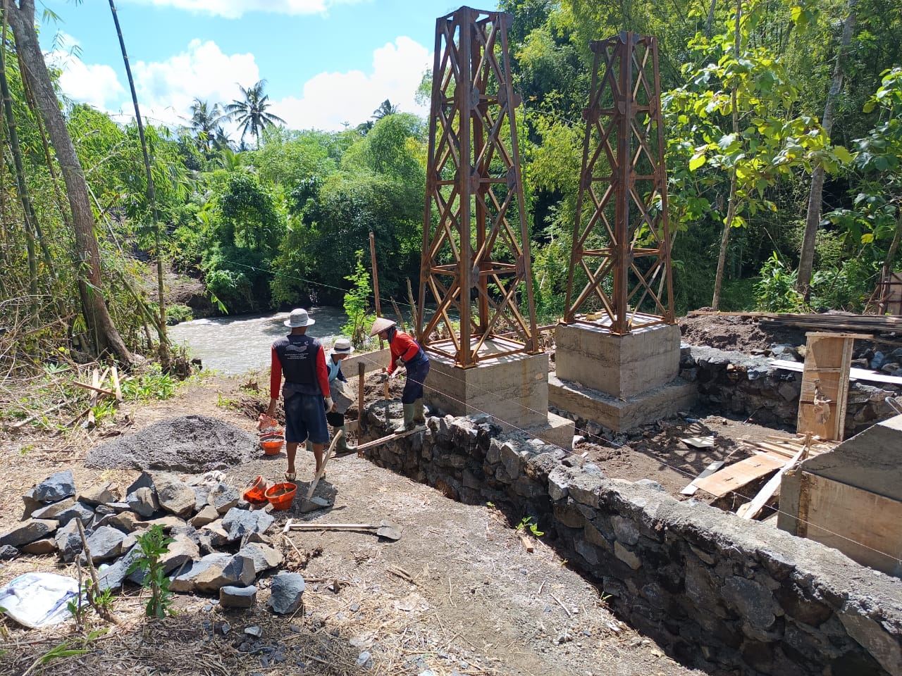 Pantauan di lapangan menunjukkan personel TNI bersama warga setempat bergotong royong mengerjakan pembangunan pondasi jembatan. Semangat kebersamaan dan kerja sama tampak jelas dalam setiap tahapan pekerjaan, meskipun proses pembangunan masih terus berlangsung.