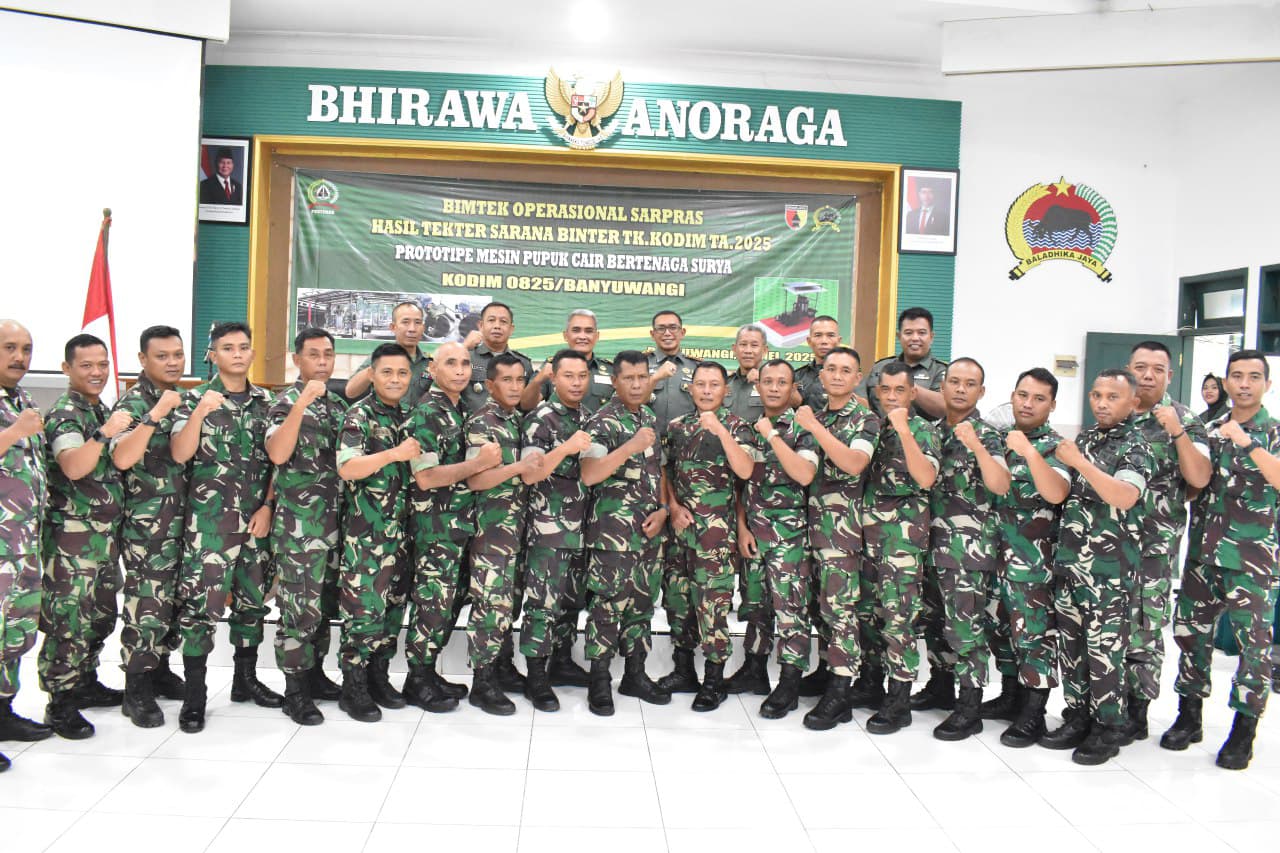 Banyuwangi, Actanews.id – Komando Distrik Militer (Kodim) 0825/Banyuwangi terus mendorong pemanfaatan teknologi dalam mendukung pembinaan teritorial. Pada Sabtu (15/2), Kodim menggelar kegiatan Pembinaan Teknis (Bintek) Operasional Sarana dan Prasarana berupa prototipe mesin pupuk cair bertenaga surya. Kegiatan ini berlangsung di Aula Panglima Sudirman, Makodim 0825, Jalan RA Kartini Nomor 02, Kepatihan, Banyuwangi. Kamis (15/5/2025).
