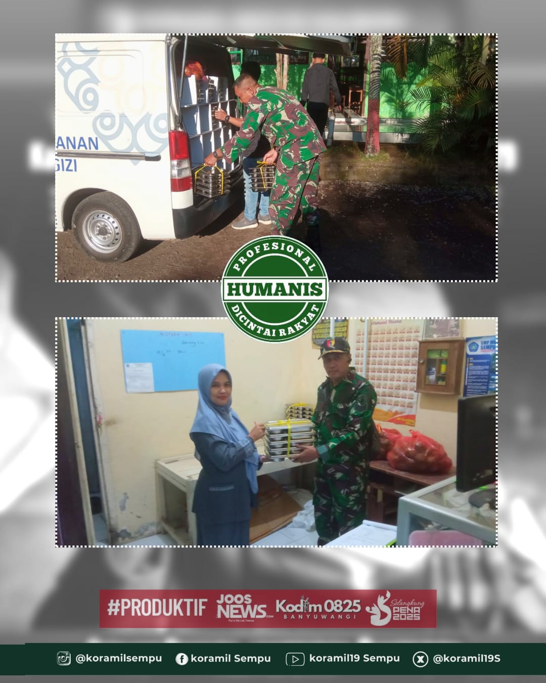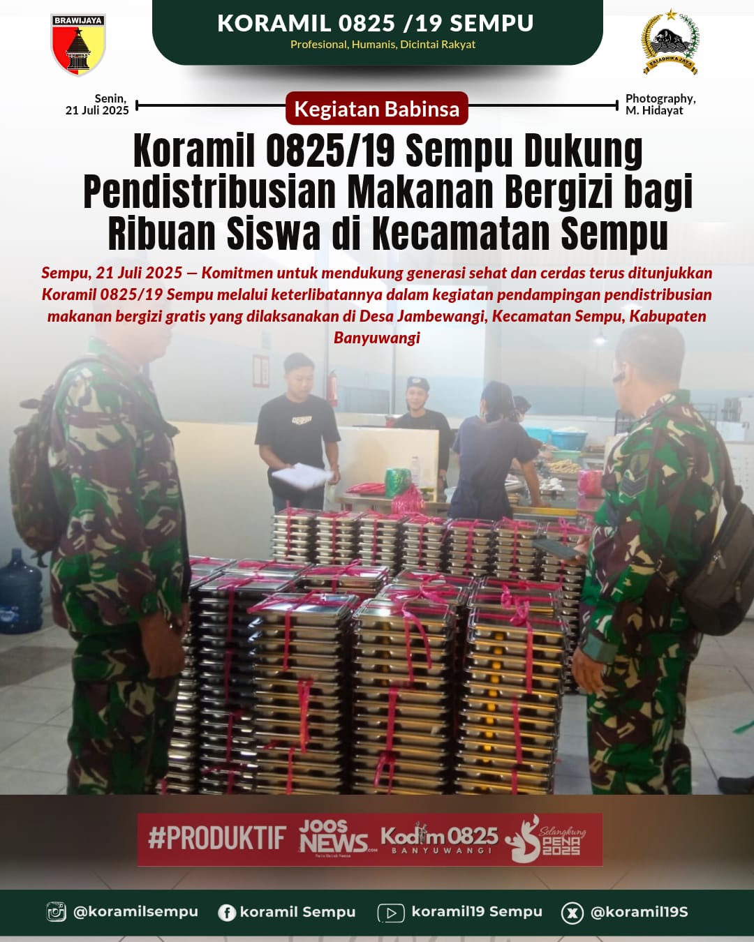 Sempu, 21 Juli 2025 — Komitmen untuk mendukung generasi sehat dan cerdas terus ditunjukkan Koramil 0825/19 Sempu melalui keterlibatannya dalam kegiatan pendampingan pendistribusian makanan bergizi gratis yang dilaksanakan di Desa Jambewangi, Kecamatan Sempu, Kabupaten Banyuwangi. Dua personel Koramil, Serka Edi Santoso dan Serda Edi Suryadi, secara aktif turun langsung mendampingi kegiatan yang digelar di SPPG Khusus Dusun Parastembok. Program ini memberikan manfaat langsung bagi ribuan siswa dari jenjang PAUD hingga SMA/SMK.