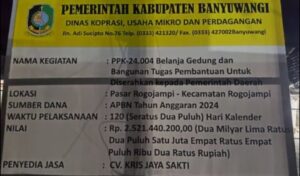 Banyuwangi, Actanews.id – Revitalisasi Pasar Rogojampi, tepatnya di sisi timur atau bagian belakang pasar yang diperuntukkan bagi pedagang daging, menarik perhatian publik. Proyek yang menelan anggaran sebesar Rp 2,52 miliar dari APBN Tahun 2024 tersebut kini menjadi fokus pengawasan Komunitas Pemerhati Banyuwangi (KPB) di Rogojampi.