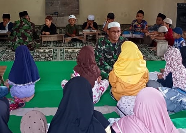 Lettu Inf. Ilyasin bersama Serka Su’in dengan sabar membimbing bacaan huruf hijaiyah. Wajah keras khas militer mereka seketika berubah ramah, penuh kasih, saat menemani anak-anak asuhan Ustadz Ali Mudori.