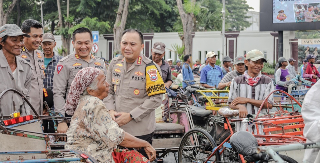 Kombes Pol Pasma Royce didampingi dengan Pejabat Utama (PJU) langsung menyapa kurang lebih sekitar 550 abang becak yang sengaja diundang untuk sarapan bersama sambil membagikan paket sembako.