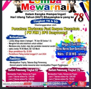 Dalam rangka peringatan Hari Ulang Tahun Bhayangkara yang ke-78, Persatuan Wartawan Fast Respon Nusantara (PW FRN) DPC. Banyuwangi akan menyelenggarakan lomba adzan dan mewarnai, pada hari Minggu, tanggal 23 Juni 2024, di Pantai Marina Boom Banyuwangi.