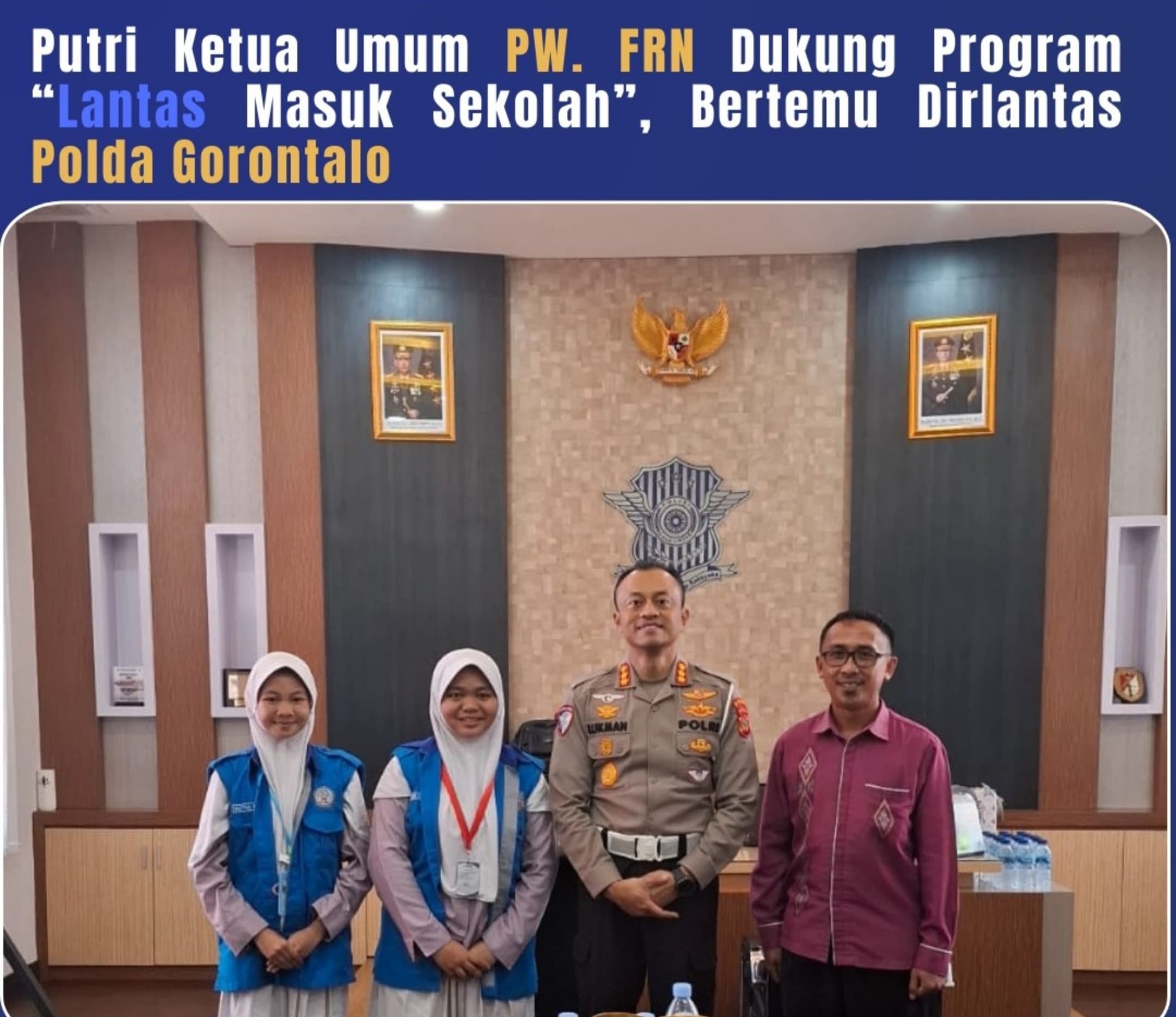 Raden Ajeng Siti Nusyabilla, pelajar SMP Madrasah Unggulan Kota Gorontalo sekaligus putri bungsu Ketua Umum Perkumpulan Wartawan Fast Respon Nusantara (PW. FRN) Counter Polri, Agus Flores, bersama Wakil Kepala Sekolah Imran Mole, berkesempatan bertemu dengan Dirlantas Polda Gorontalo, Kombes Pol. Lukman Cahyono.