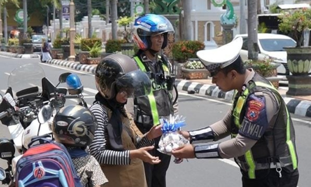 Seperti yang terlihat pada Sabtu (09/03/2024), sejumlah anggota satlantas Polres Tuban berjajar di jalan raya memberikan souvernir berupa boneka kepada para pengguna jalan yang dinilai mematuhi aturan dalam berlalu lintas.