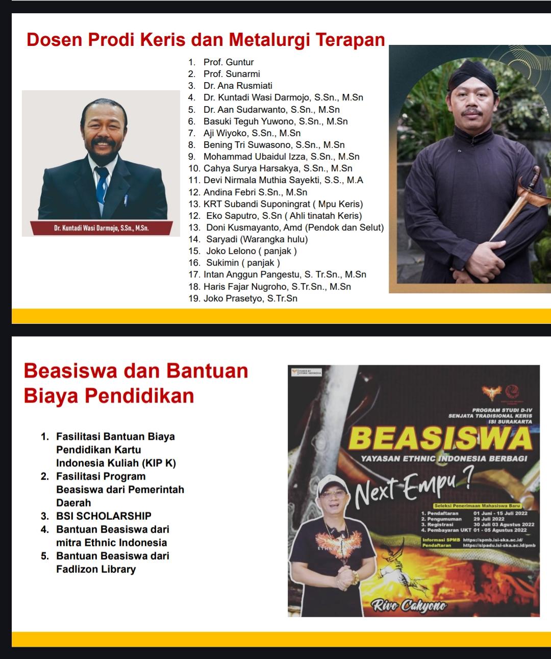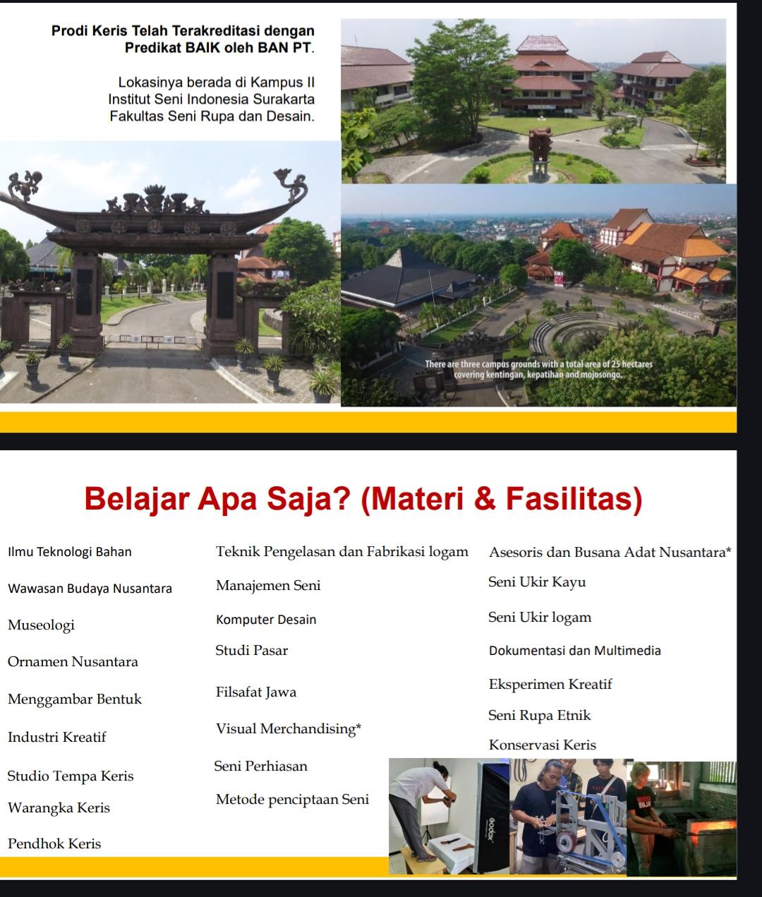 Program Studi Keris & Metalurgi Terapan ISI Surakarta merupakan satu-satunya program pendidikan tinggi di dunia yang secara khusus memadukan kearifan lokal keris Nusantara dengan ilmu metalurgi terapan serta teknologi manufaktur modern.