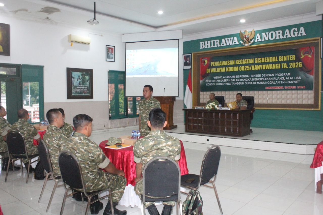 BANYUWANGI – Upaya memperkuat sinergi antara TNI dan pemerintah daerah kembali ditegaskan melalui kegiatan pengawasan Sistem Perencanaan, Pengendalian, dan Evaluasi Pembinaan Teritorial (Sisrendal Binter) yang digelar di Aula Panglima Sudirman, Makodim 0825/Banyuwangi, Jalan RA Kartini Nomor 02, Kepatihan, Selasa (14/04/2026).