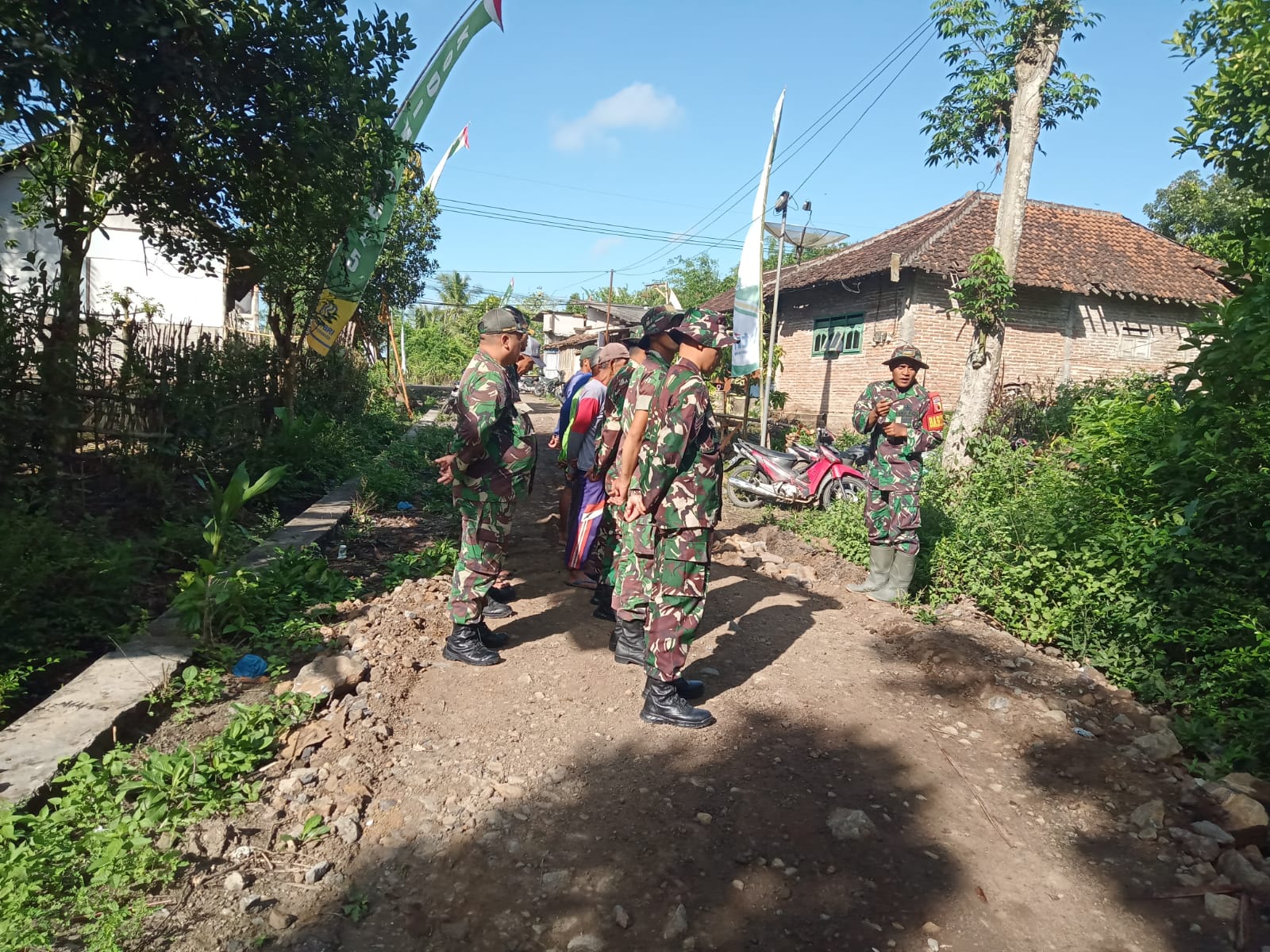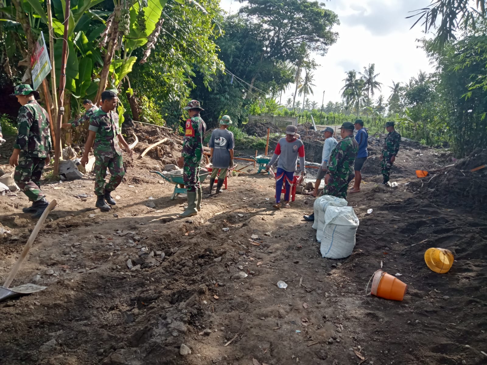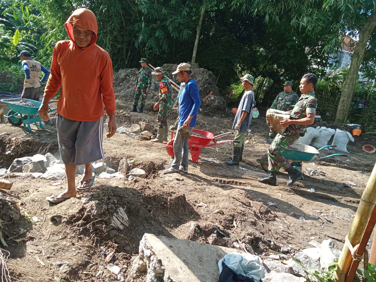 Di lokasi, tampak Babinsa bersama warga dengan semangat melaksanakan pemadatan tanah, pemasangan besi, serta pengecekan kesiapan alat pengecoran. Material seperti batu, semen, dan kayu terus didatangkan secara bertahap.