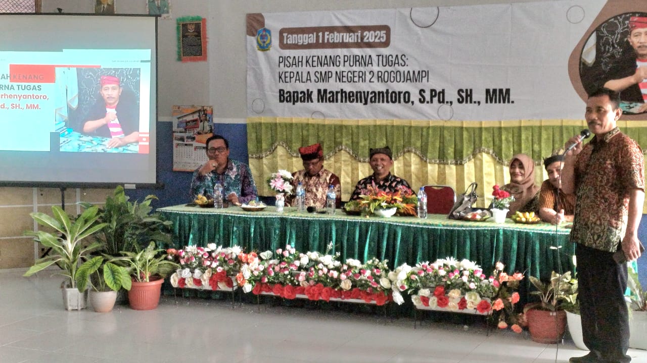 Banyuwangi, Actanews.id  – SMP Negeri 2 Rogojampi, Kabupaten Banyuwangi menggelar acara pisah kenang purna tugas Kepala Sekolah, Bapak Marhenyantoro, S.Pd., SH, MM, yang telah memasuki masa pensiun, pada Sabtu (1/2/2025). Acara yang penuh dengan kesan dan kebersamaan ini berlangsung di aula terbuka sekolah dengan suasana yang hikmat dan penuh kekeluargaan.