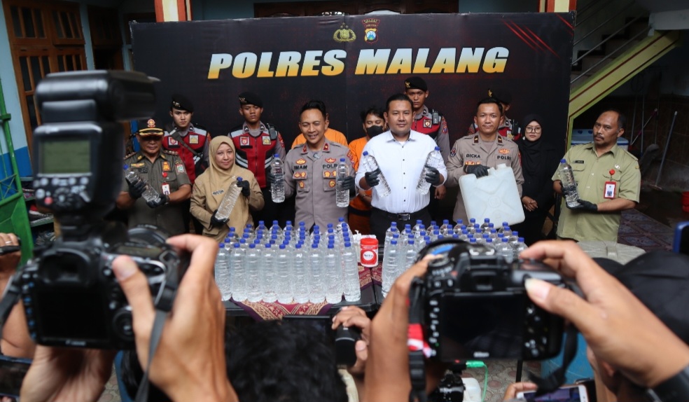 “Kami dari jajaran Polres Malang melaksanakan konferensi pers ungkap kasus minuman keras ilegal dengan tepat kejadian perkara langsung ini di lokasi Dusun Krajan RT 10 RW 3 Desa Sumberejo Kecamatan Gedangan kabupaten Malang,” kata Kompol Imam Mustolih, Senin (25/3).