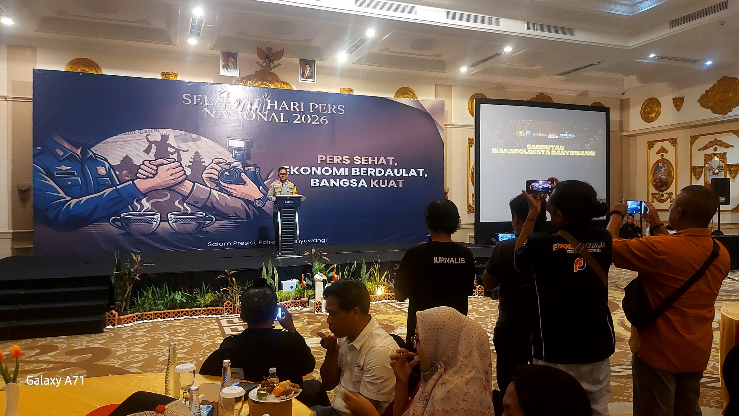 Banyuwangi, Actanews.id – Kepolisian Resor Kota (Polresta) Banyuwangi menggelar kegiatan Peringatan Hari Pers Nasional (HPN) Tahun 2026 dengan tema “Pers Sehat, Ekonomi Berdaulat, Bangsa Kuat”, yang berlangsung di hall room Hotel Aston Banyuwangi, Senin (9/2/2026) siang.