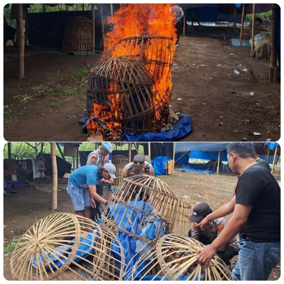 Sebagai langkah antisipasi dan bentuk peringatan, petugas kemudian melakukan pemusnahan terhadap fasilitas yang diduga digunakan untuk aktivitas judi sabung ayam, berupa kurungan ayam, terpal, dan karpet, dengan cara dibakar di lokasi.