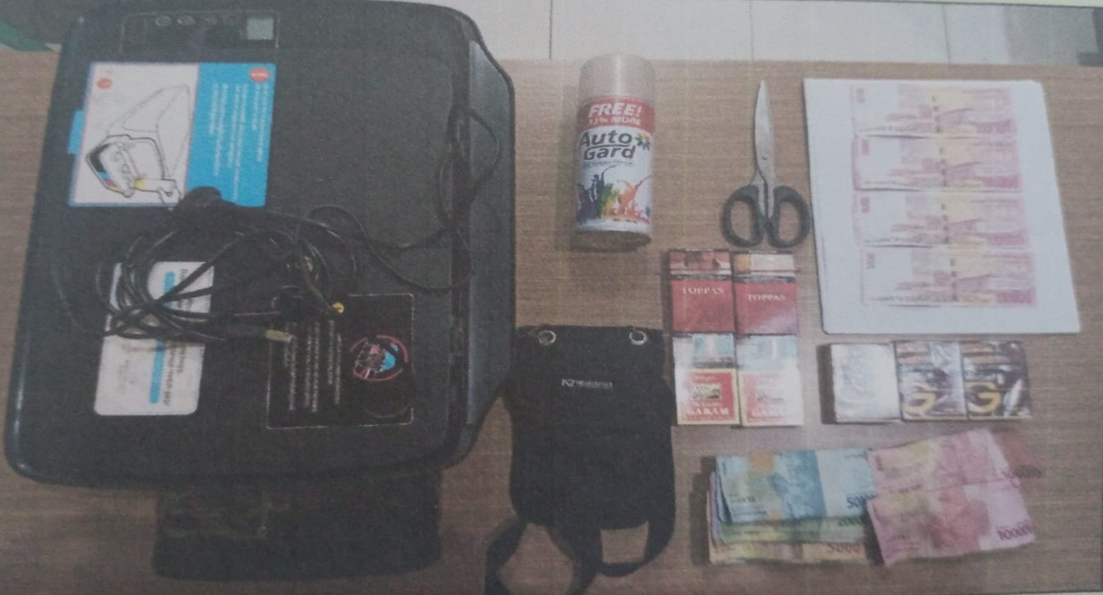 Dalam proses pemeriksaan, teridentifikasi dua tersangka dengan inisial JU dan LH, keduanya berusia 23 tahun. Barang bukti kejahatan yang berhasil disita meliputi empat lembar uang palsu pecahan Rp100.000, uang asli, rokok hasil pembelian, printer, gunting, pilox, sisa kertas uang cetak palsu, dan satu tas selempang hitam.