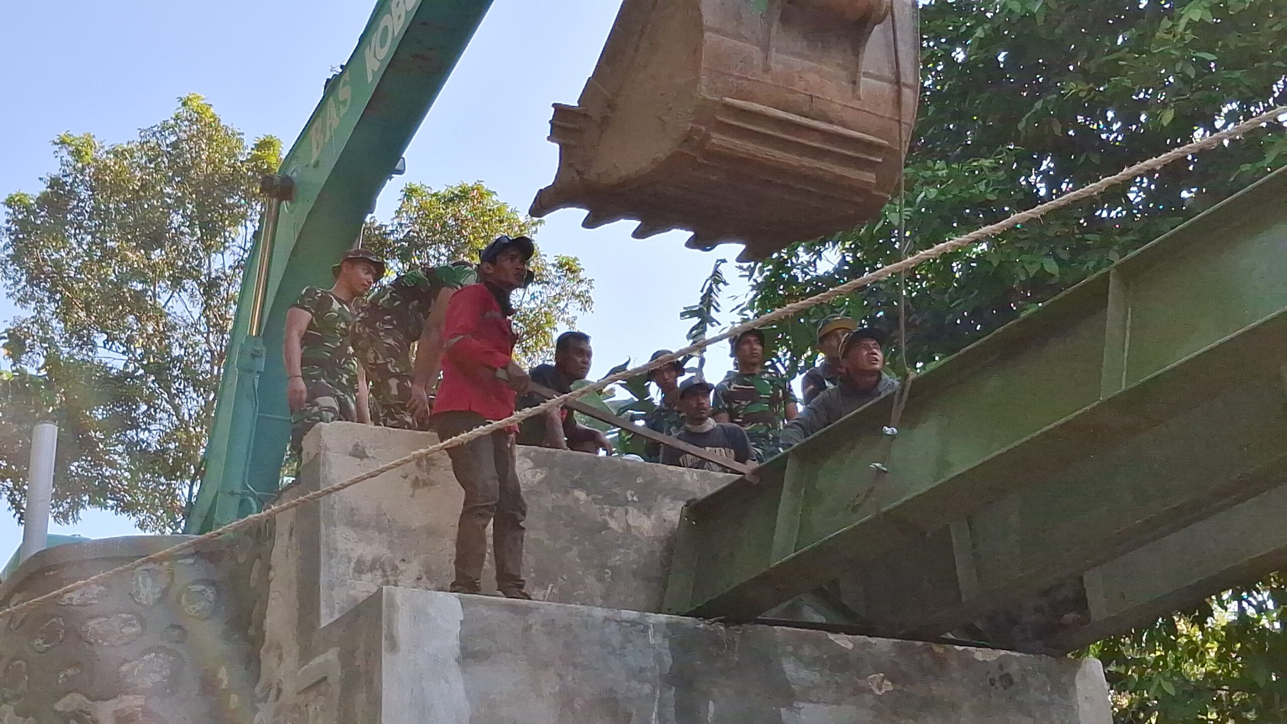 Di lokasi pengerjaan, anggota Satgas TMMD dan masyarakat setempat bahu-membahu mengangkat dan merakit besi-besi tulangan di atas dua pondasi jembatan yang telah berdiri kokoh. Proses ini merupakan salah satu tahapan paling penting dalam konstruksi jembatan, karena kerangka besi ini akan menjadi “tulang” yang menopang seluruh struktur jembatan sebelum dilakukan pengecoran.