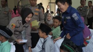 Senyumannya yang ramah, Polwan Polres Mojokerto ini mampu menenangkan anak – anak yang mengikuti khitan masal.