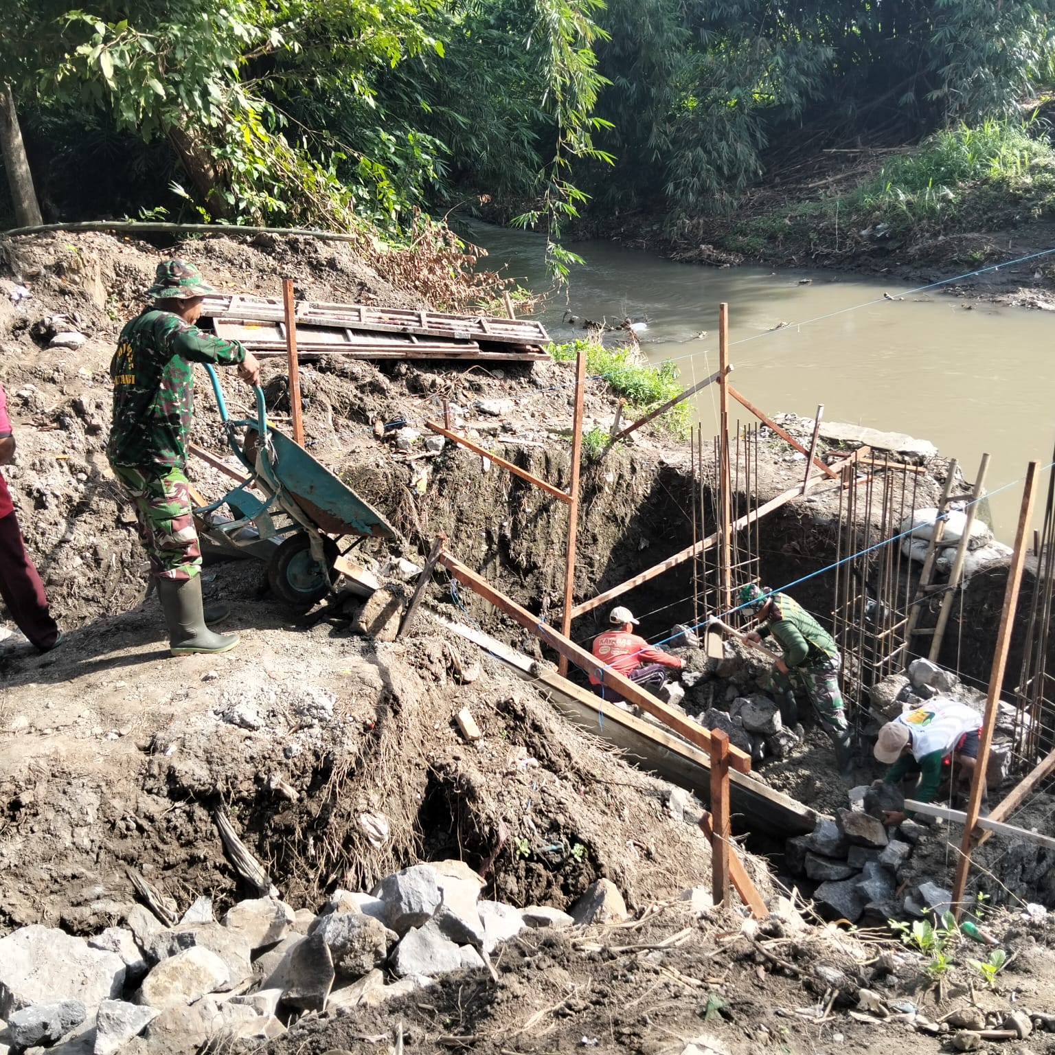 Para Babinsa bersama warga bahu-membahu mengangkut material seperti batu, pasir, dan semen menuju lokasi pembangunan jembatan penghubung desa. Suasana gotong royong terasa kuat, mencerminkan semangat kemanunggalan TNI dan rakyat dalam wujud nyata.