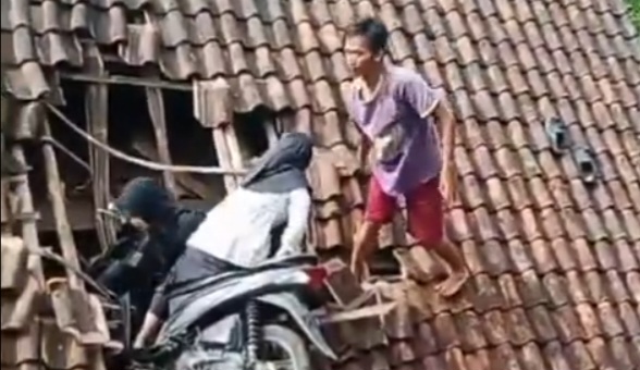 Dilansir dari laman Instagram @awreceh.id, Selasa (12/3/2024), sepeda motor yang dikendarai oleh dua orang perempuan tersebut meluncur dan menghantam genteng sebuah rumah hingga hancur berserakan, dua perempuan terlihat terjebak di atas atap rumah, sementara seorang warga berusaha membantu mereka.