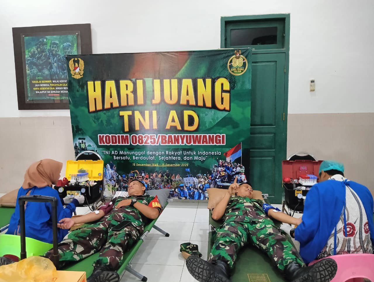 BANYUWANGI,  Actanews.id — Dalam rangka menyambut Hari Juang TNI AD dan Hari Ulang Tahun Kodam V/Brawijaya, Kodim 0825/Banyuwangi menggelar aksi donor darah bertajuk “TNI AD Manunggal Dengan Rakyat Untuk Indonesia Bersatu, Berdaulat, Sejahtera dan Maju.” Kegiatan kemanusiaan ini berlangsung di Aula Panglima Sudirman, Makodim 0825 Jalan RA Kartini No. 02, Kepatihan, Banyuwangi, Jumat (12/12/2025).